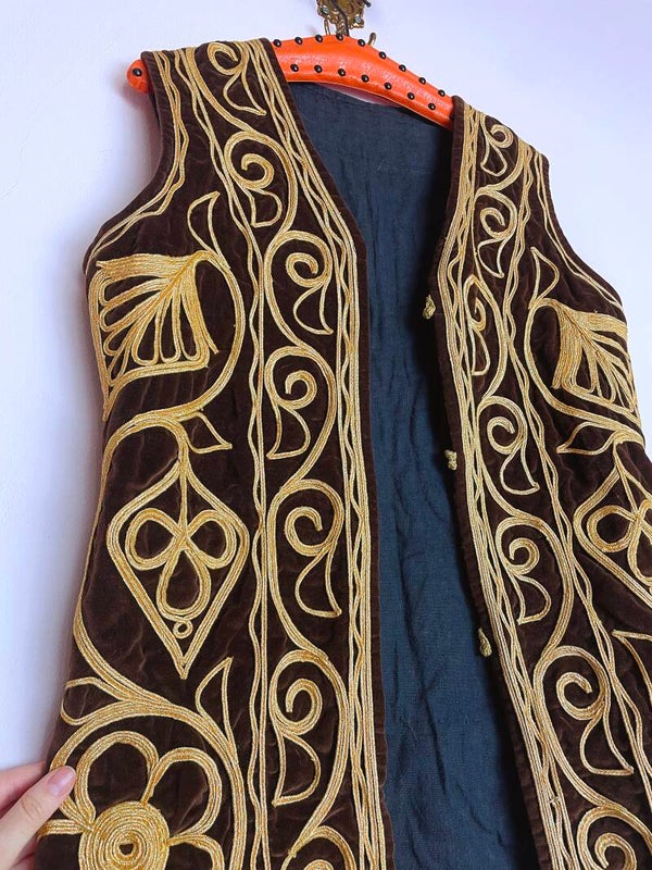 Is there a better thing than a fully embroidered vintage waistcoat? I think not! This absolute babe is waiting for a new owner to make them feel magical. She is a warm brown velvet, fully embroidered with golden shiny thread and in very beautiful condition. The only thing missing is the buttons but it's not that noticeable, especially when these waistcoats are often worn open.