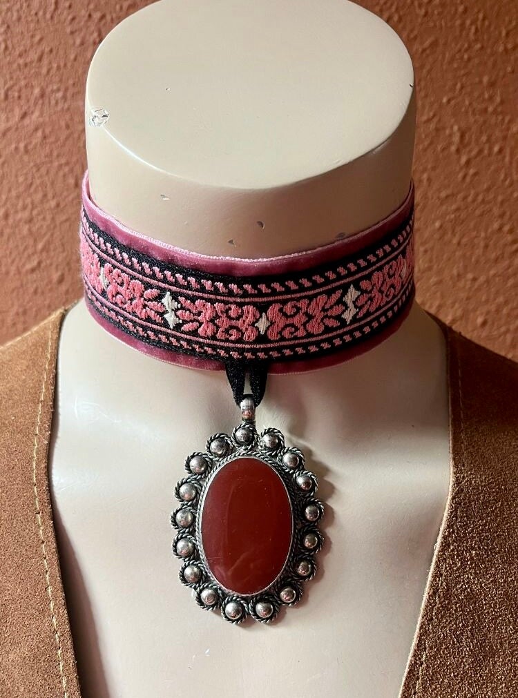 Each of these gorgeous handmade chokers are made by hand with true vintage materials (some pendants are second hand, this will be reflected in the price). They are unique pieces and of a kind, just like you! The choker can be made out of one or multiple kinds of ribbons, sewn together with love by Bonjour Kaar. Bigger chokers are lined for comfortable wear. Smaller chokers often don’t need this but are made with an eye for detail. Every piece has a loop which will help you close the choker with a button. Please give us the circumference of your neck while placing your order so your choker can be tailored to your size!