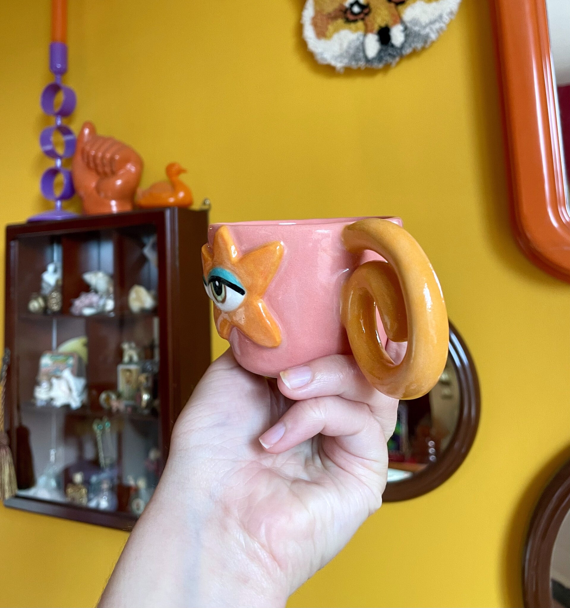 The Starry Baby mug is hand: thrown, sculpted, painted & glazed with a lot of love and eye for detail. Every stroke of colour is applied three times to achieve a opaque colour. The bottom of the mug is signed with the Bonsoir Saar logo. A ceramic piece to love forever. Unfortunately there is a small darker spot on the backside that appeared during firing. This is ofcourse reflected in the price.