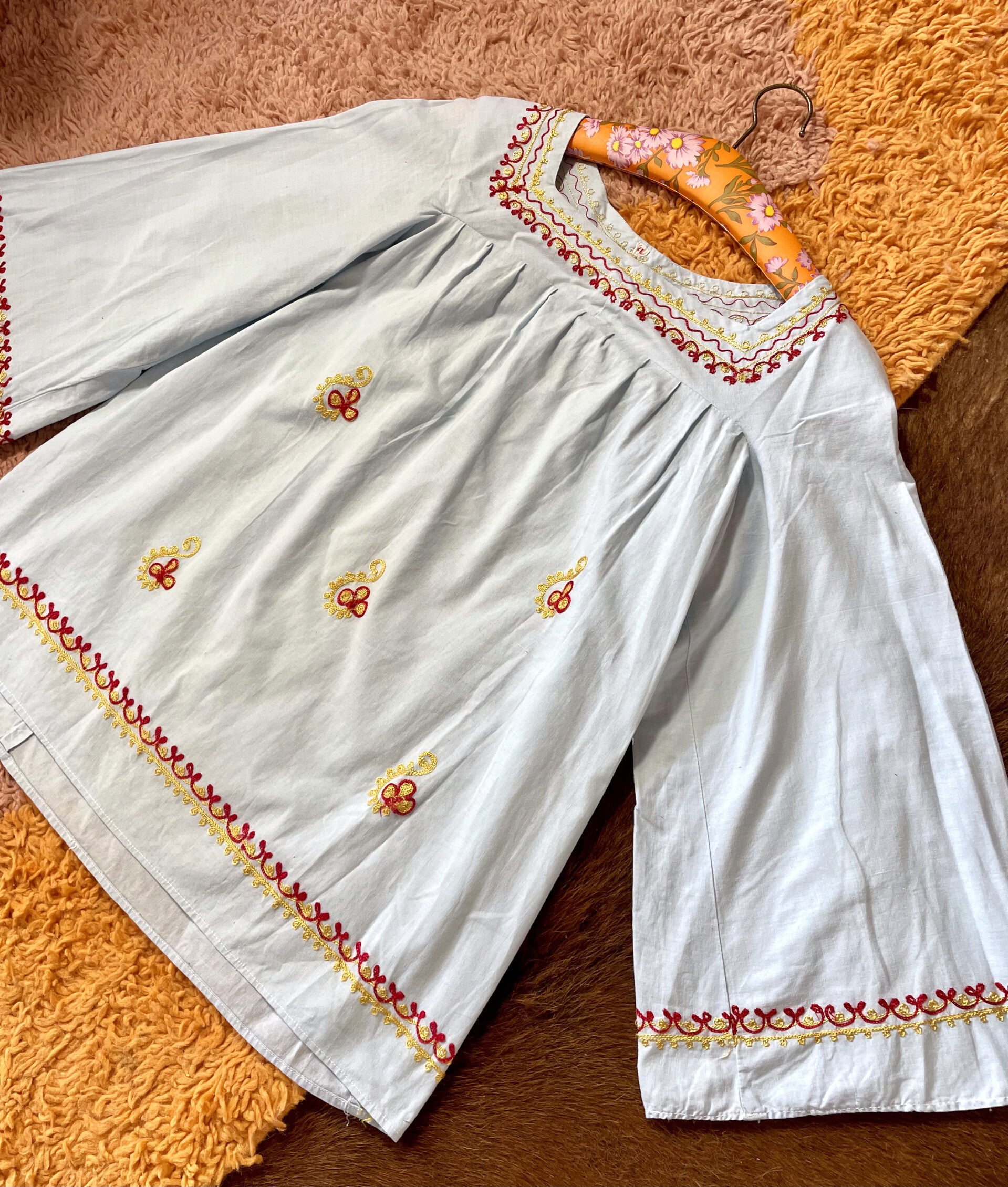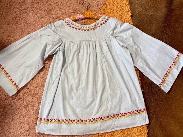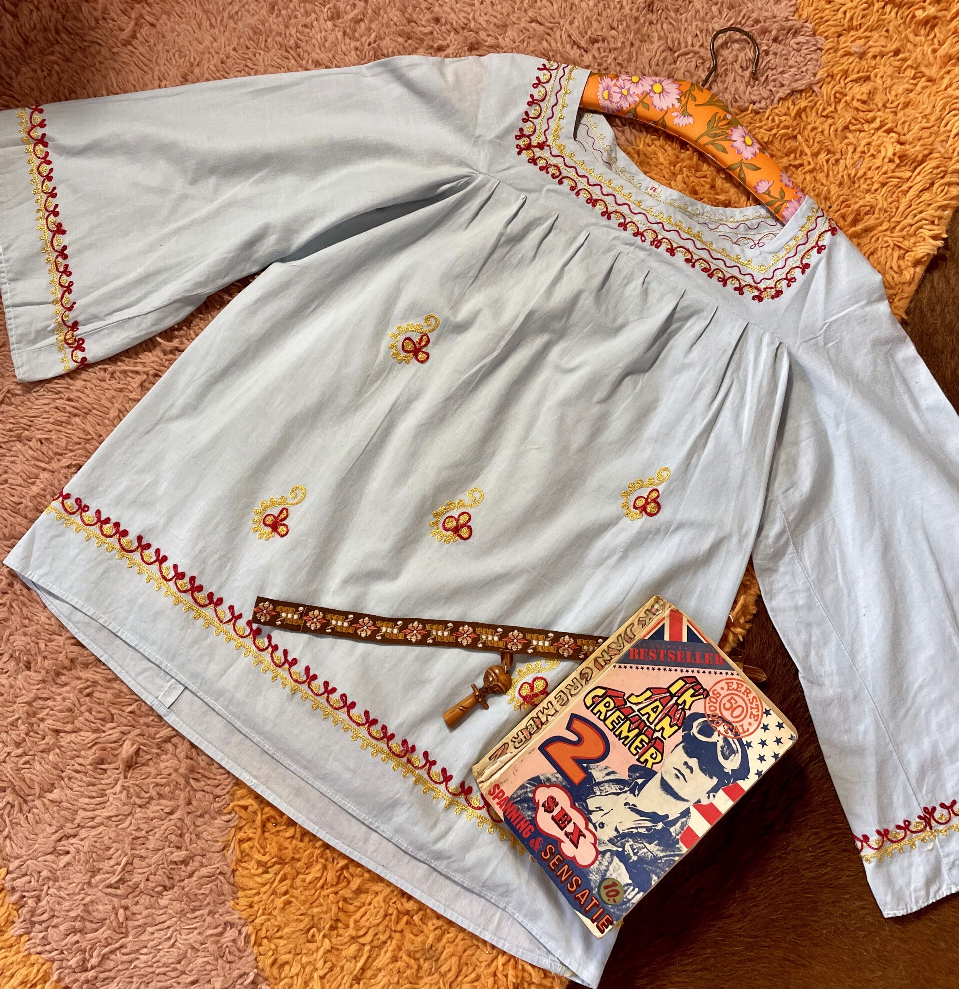 This cotton dream of an 70s Indian blouse is embroidered to perfection and a great layering piece. She has a wide silhouet and is a lovely quality. The base colour is a baby blue. She is in good vintage condition but the embroidery is not fully perfect, this is not noticeable when wearing and normal for her age.