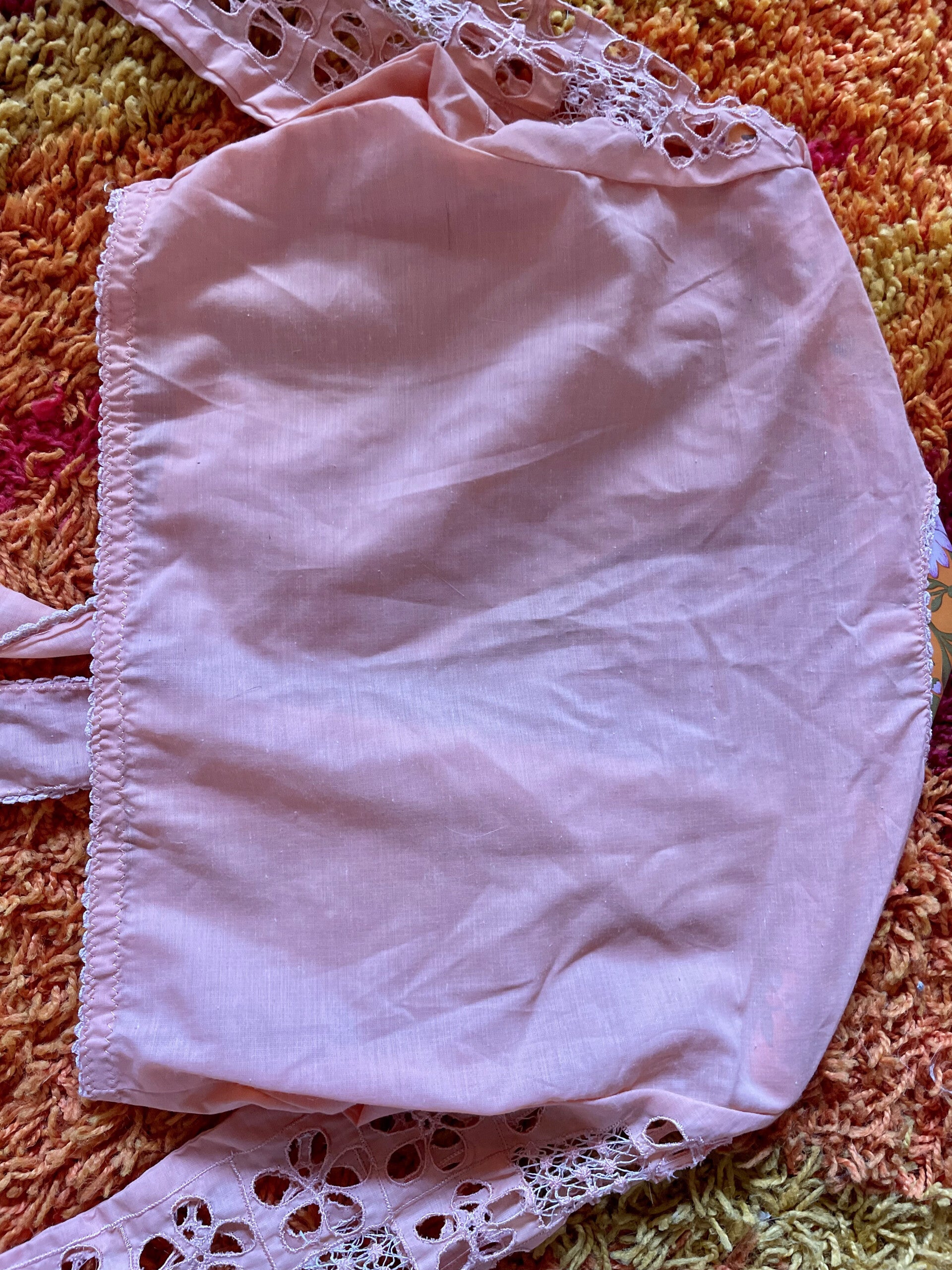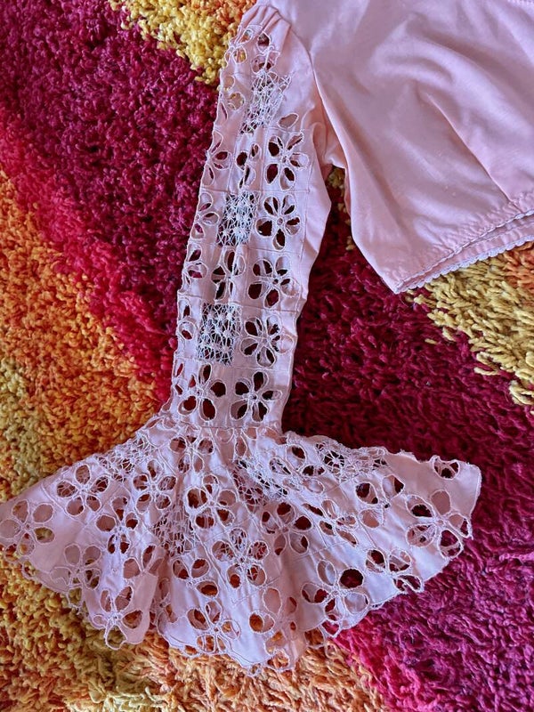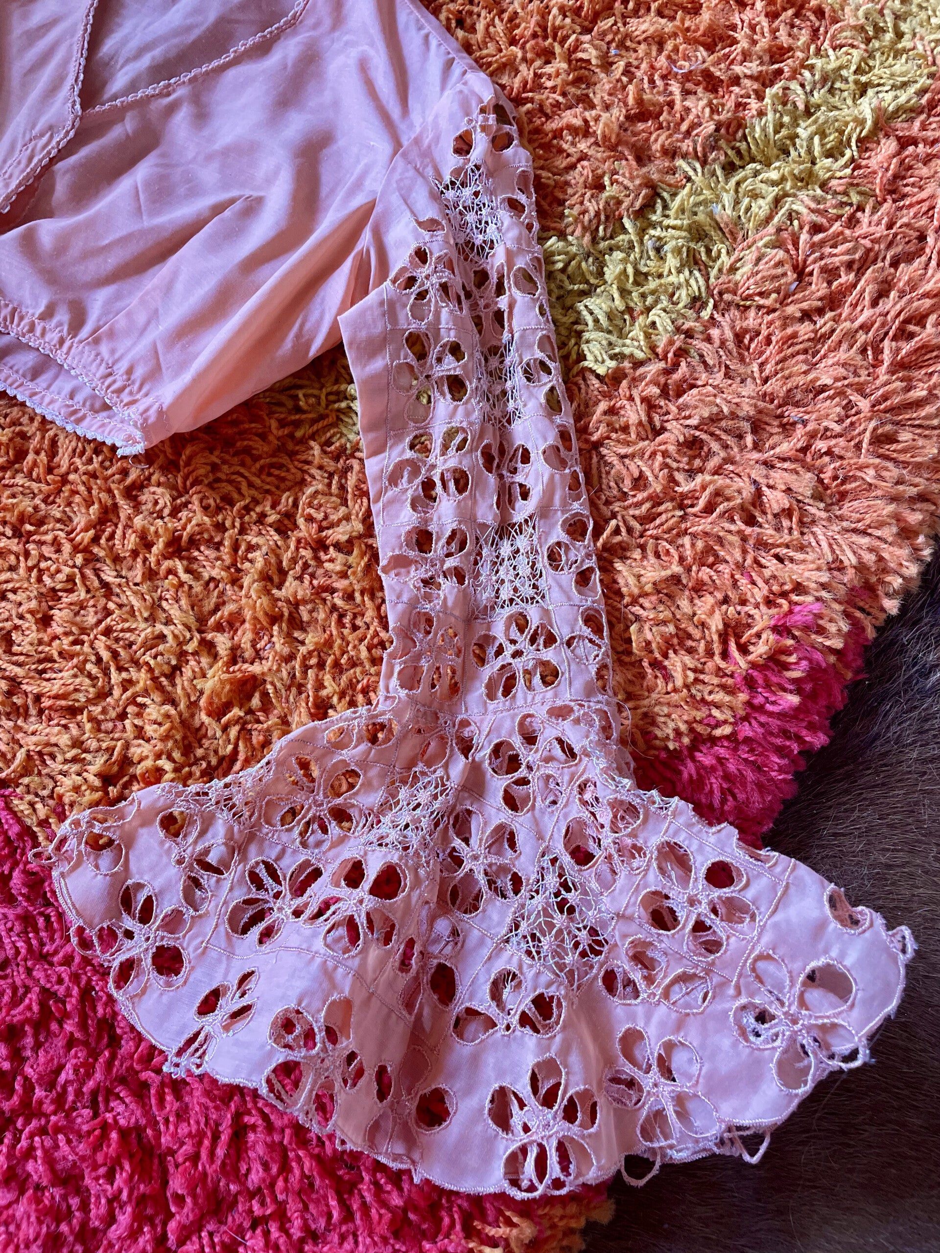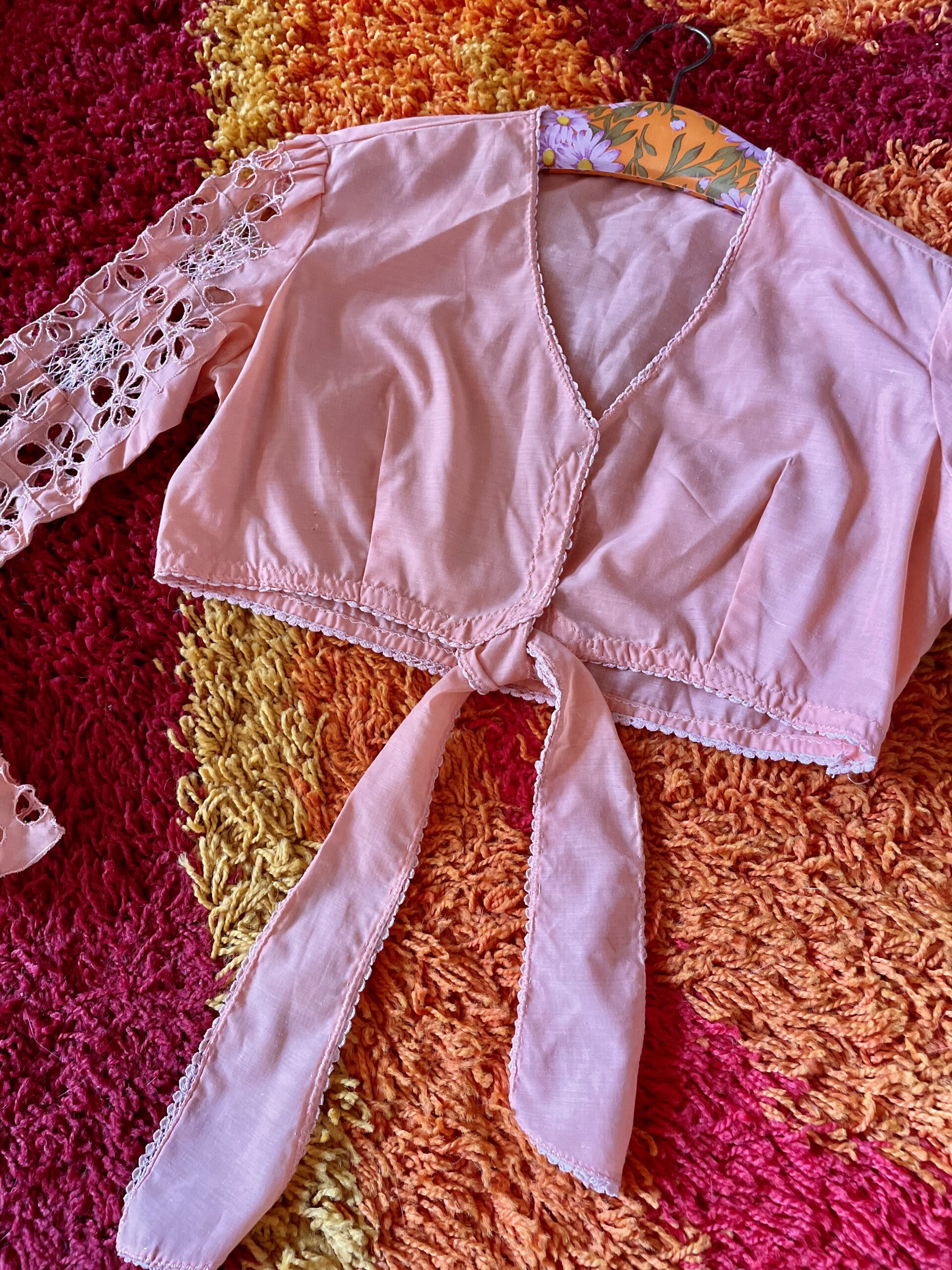 Ooh la la! Isn't this romantic but oh so rock & roll top a dream come true? I mean, the sleeves!! The coral blushy colour is just the icing on the cake. This top is cotton, cropped and ties with two pieces of fabric in the front. She is in great condition and a rare vintage item from the 70s.